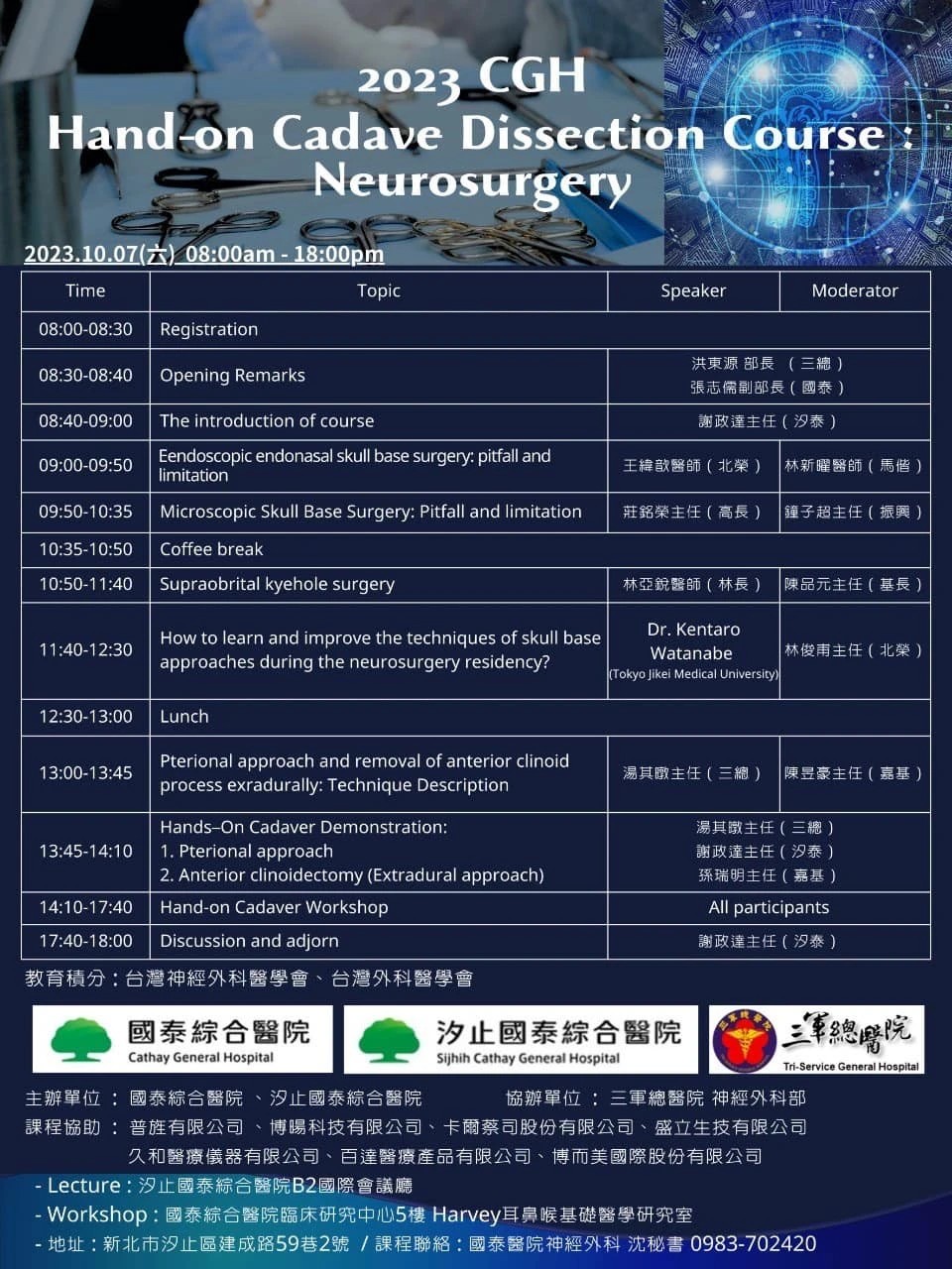 國泰體系神經外科顱底解剖實作營已經舉辦多年。核心人物就是萬能秘書長-謝政達,達哥。住院醫師參加完全免費。他們和三總的顱底實驗室共同經營。小而美,簡單且精緻,已經自成品牌,在幾乎都是商業型的顱底解剖實作營中獨樹一格。