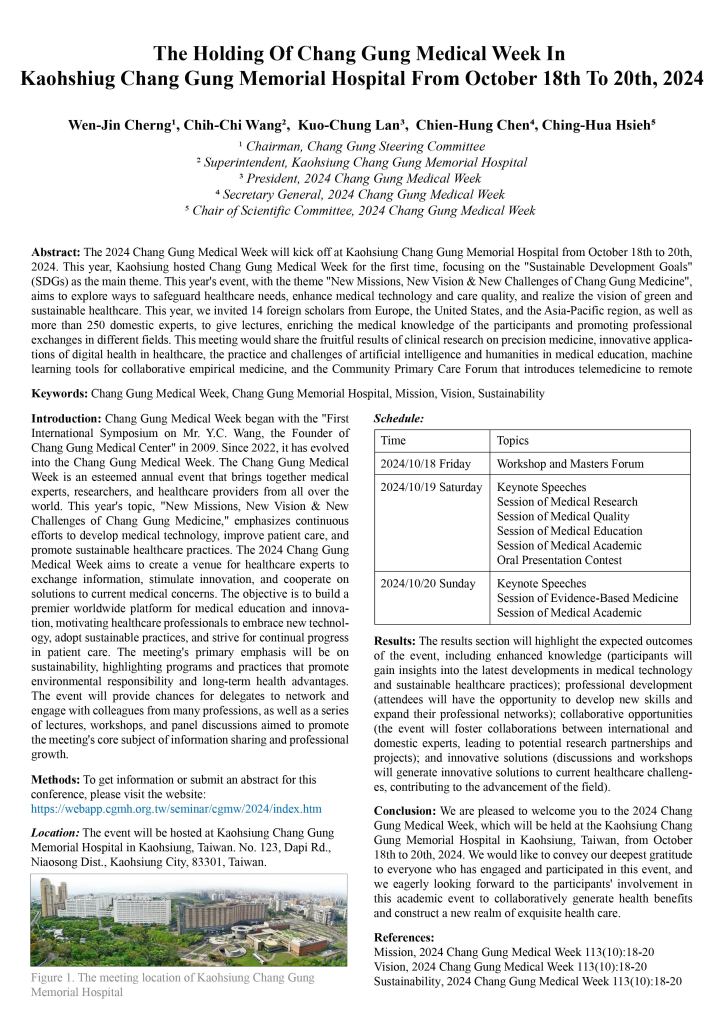 2024長庚醫學週10月18日至20日在高雄長庚醫院展開為期三天的活動,此次是長庚醫學週首次移師至高雄舉辦,議程安排方面以永續發展為主軸,內容涵蓋層面廣闊,期待藉由國際學術研討會的舉辦,邀請國內外學者針對特定醫療主題與各種教學新知進行多元化的學術交流,體現王永慶創辦人對於醫學教育以及醫療品質理念的重視與傳承。