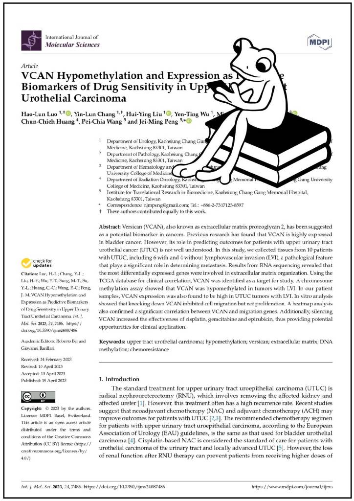 Versican(VCAN),又被稱為細胞外基質蛋白多醣,已被提議作為癌症濳在生物標誌物。先前的研究發現,VCAN在膀胱癌中高度表達。然而,它在預測UTUC患者的預後方面的作用尚不明確。根據我們團隊的研究,VCAN表達和染色體甲基化水平可能是預測淋巴轉移陽性的有用標誌物。此外,VCAN有望作为一種生物標誌物,用於識别患者,這些患者更容易罹患癌症或對藥物治療有更好的反應。